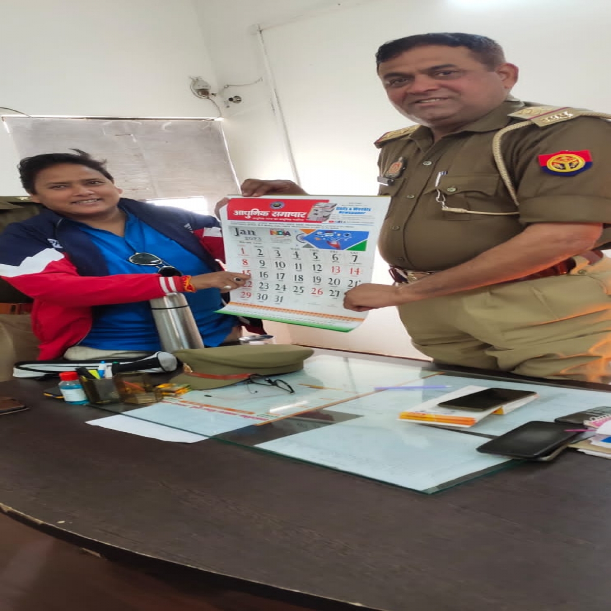 थाना मुट्ठीगंजके अंतर्गत मालवीय नगर पुलिस चौकी इंचार्ज मनोज कुमार सिंह को नव वर्ष कैलेंडर भेंट किया।